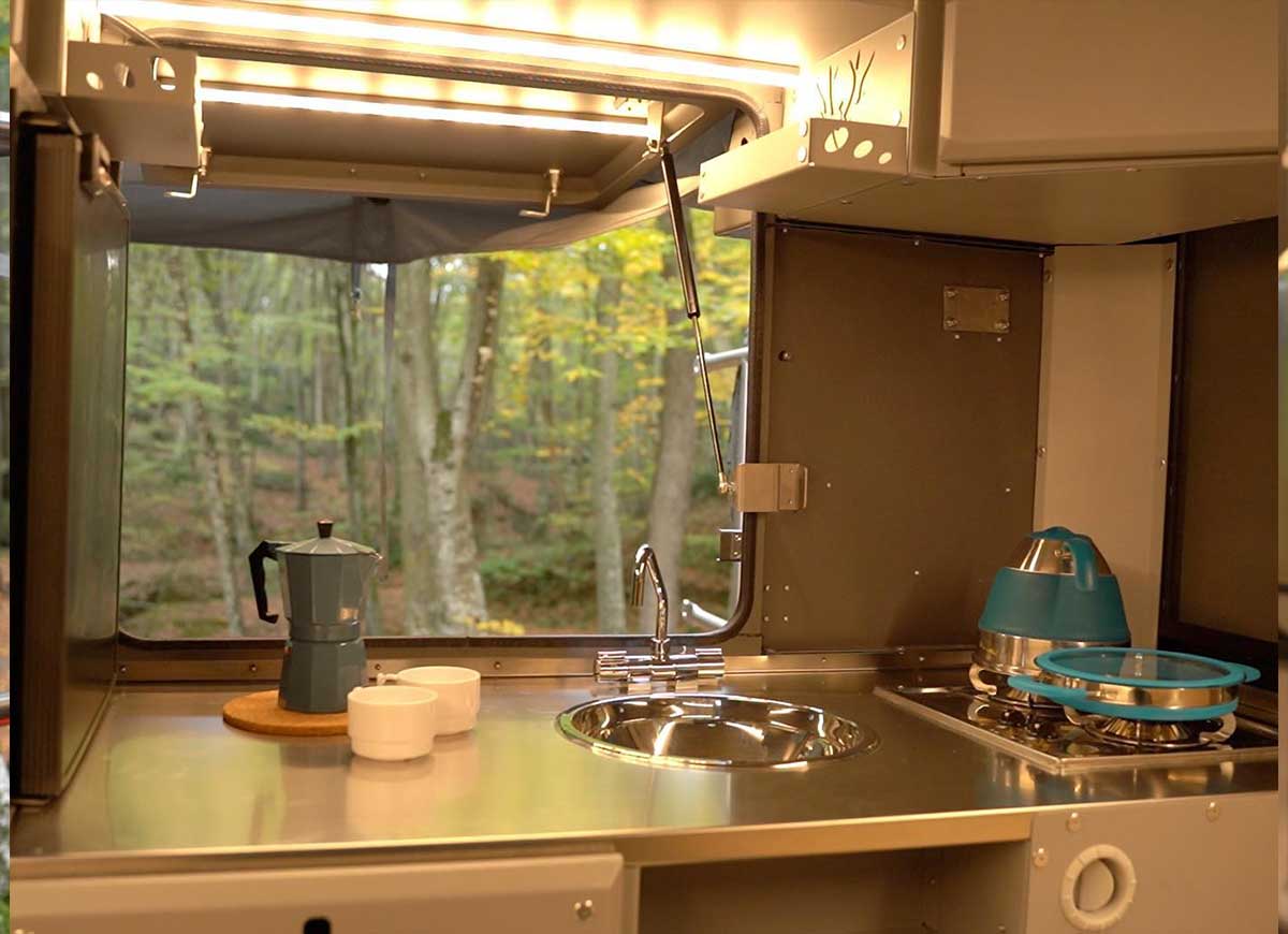 Vše pod jednou střechou: karavan, nádobí, prádlo a nyní také jídlo.
